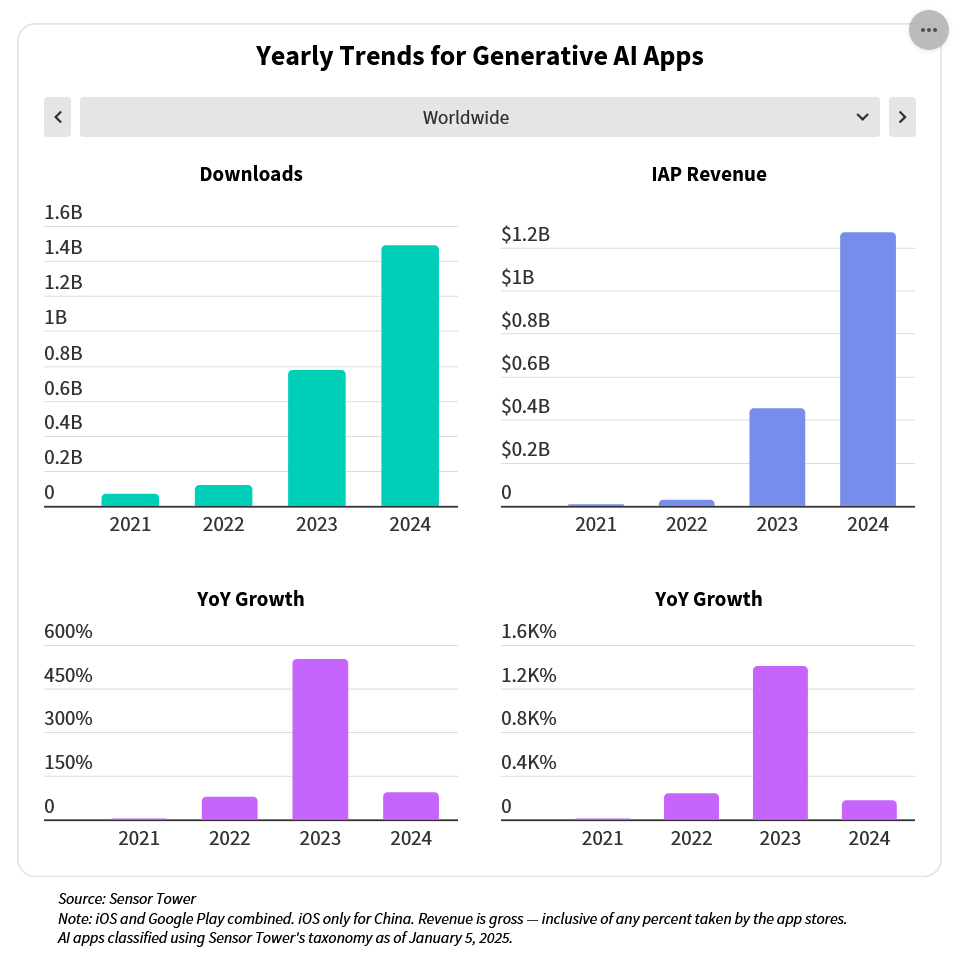 人工智能应用已经是一个十亿美元级的产业,2024 年,AI 聊天机器人和 AI 艺术生成器应用的应用内购收入接近 13 亿美元。
