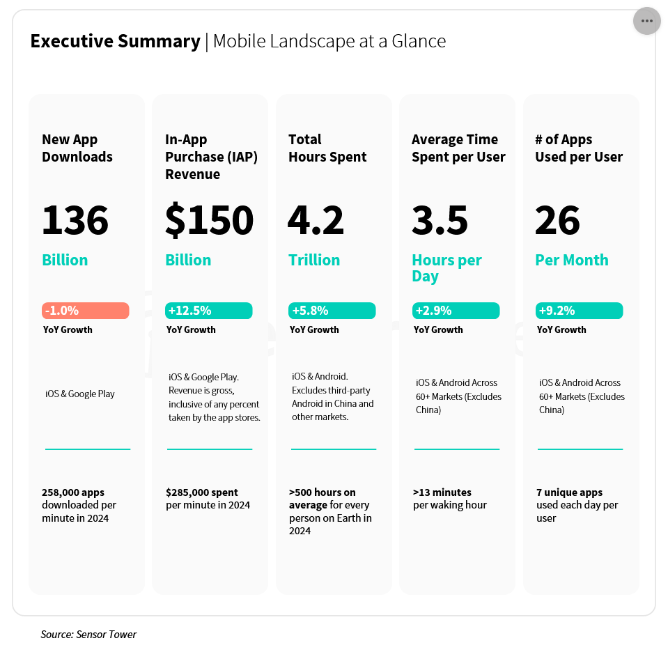 消费者在苹果 App Store 和谷歌 Play Store 应用上花费了 4.2 万亿小时,相当于每个移动用户每天约 3.5 小时。然而,有迹象表明,随着一些国家 / 地区的消费者出现数字疲劳,移动设备使用时间增长正在放缓。全球使用总时长同比增长 5.8%,略低于 2023 年 7.7% 的同比增幅。
