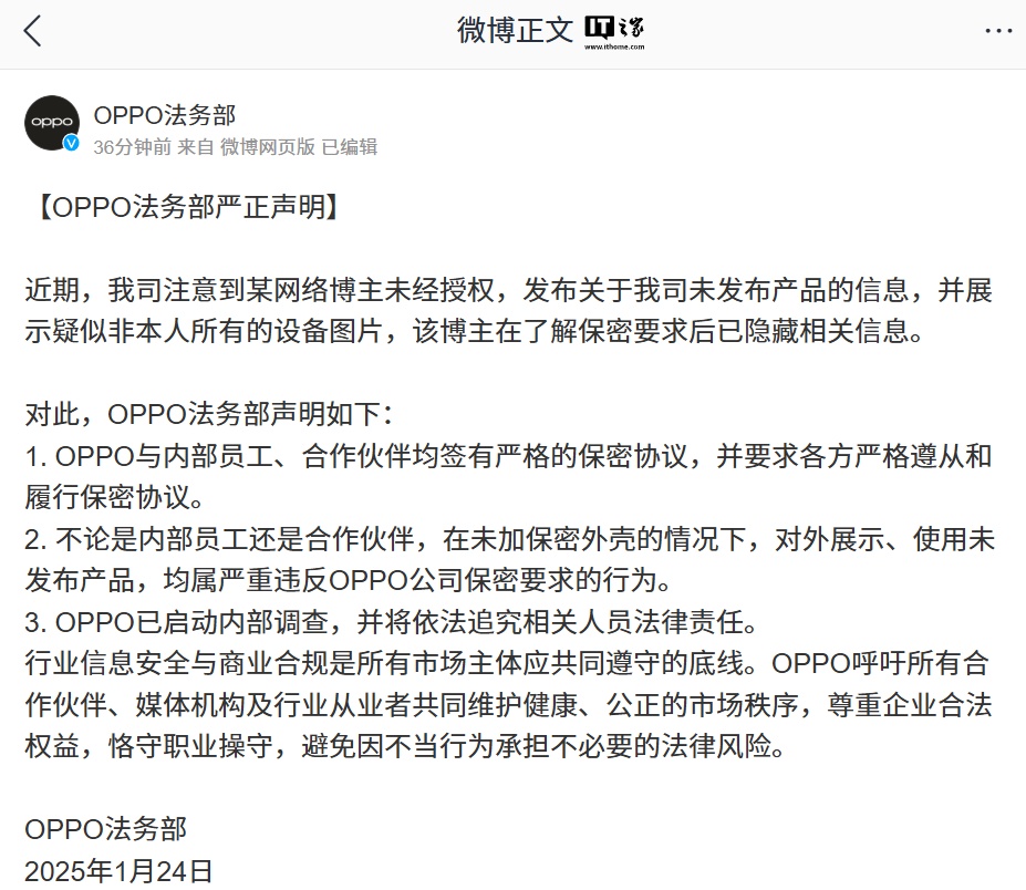 IT之家 1 月 24 日消息,OPPO 法务部今日发布声明,称某网络博主未经授权,发布了关于未发布产品的信息,并展示疑似非本人所有的设备图片。目前 OPPO 已启动内部调查,并将依法追究相关人员法律责任。