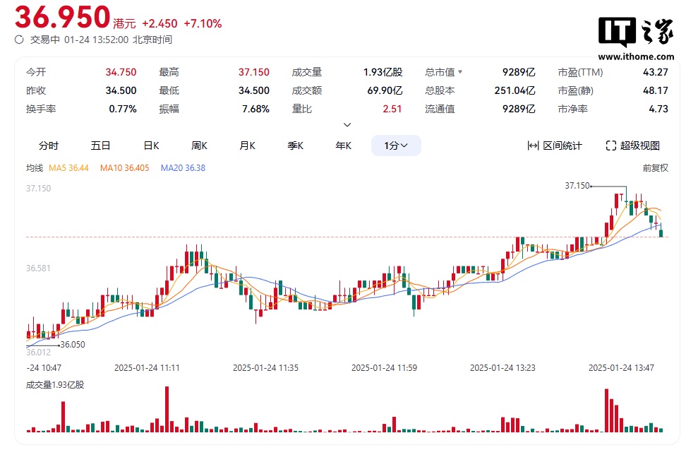 IT之家 1 月 24 日消息,小米集团午后涨超 7%,报 37.1 港元 / 股,再创历史新高。截至IT之家发文,小米集团股价 36.950 港元,市值 9289 亿港元(IT之家备注:当前约 8689.24 亿元人民币)。