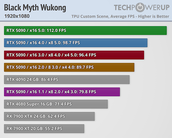《黑神话:悟空》中,在 1080P、PCIe 5.0x16 下,RTX 5090 的帧率为 112,而在 PCIe 4.0x16 下,RTX 5090 的帧率则为 98.7,损失性能约 11%。在 2K、4K 分辨率下则表现正常。