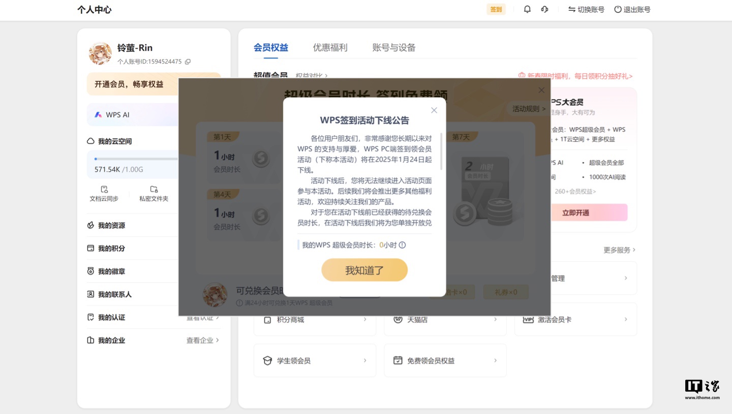IT之家 1 月 24 日消息,金山 WPS 旗下 WPS Office PC 端签到领会员活动现已下线,此前用户通过活动页面获得的待兑换会员时长可通过【WPS 客户端个人中心】-【会员权益右侧消息提醒】路径进入兑换入口自助兑换。