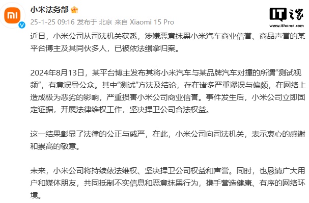 IT之家 1 月 25 日消息,小米法务部今日发文称,近日,小米公司从司法机关获悉,涉嫌恶意抹黑小米汽车商业信誉、商品声誉的某平台博主及其同伙多人,已被依法缉拿归案。