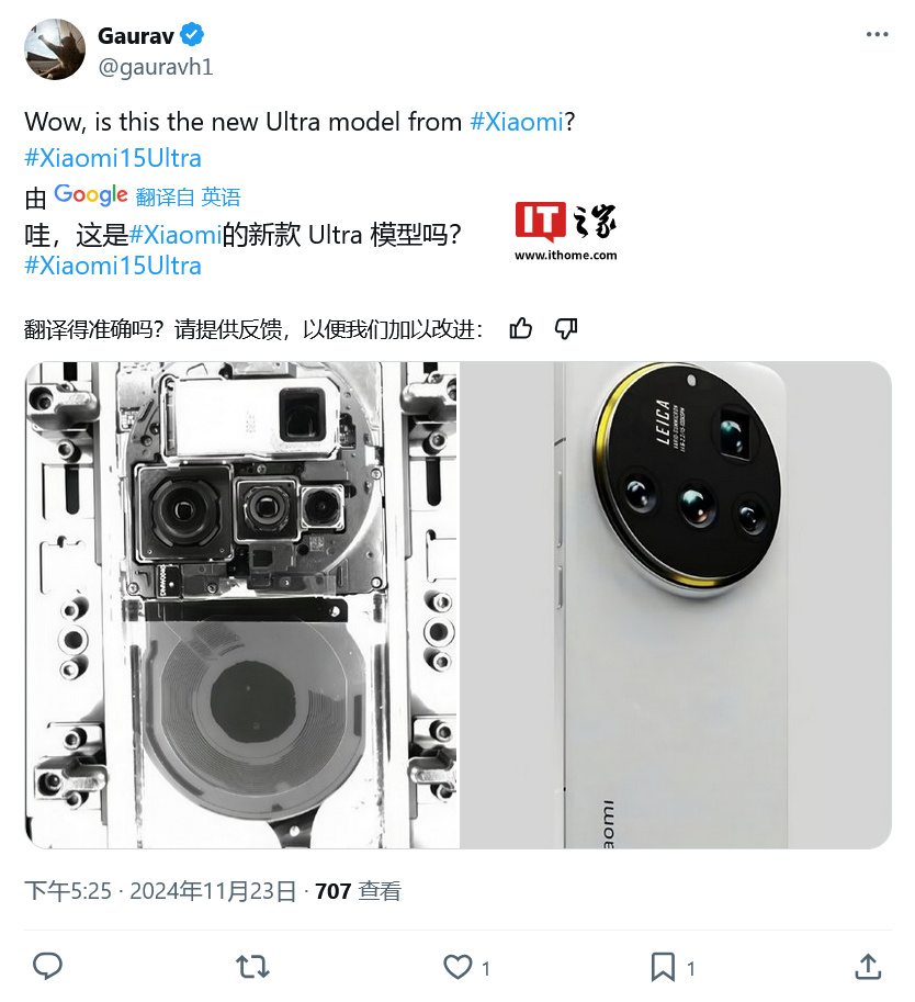 IT之家 1 月 25 日消息,消息源 @gauravh1 昨日(1 月 24 日)在 X 平台发布推文,分享了疑似小米 15 Ultra 旗舰手机的真机照片。
