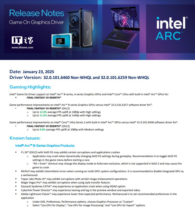 IT之家 1 月 25 日消息,英特尔昨日发布了最新的 Arc GPU 显卡驱动程序 101.6460 Beta 版,为《最终幻想 VII 重生》提供了优化。