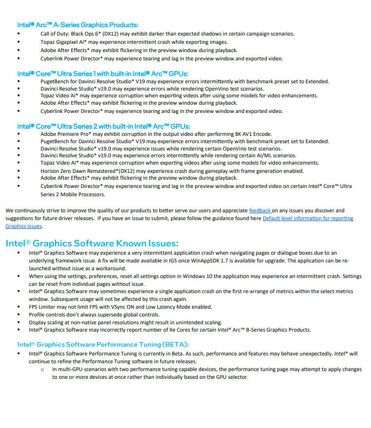 英特尔公告显示,该驱动没有修复任何 Bug,但却发现了一些 Arc B 系列 GPU 的新 Bug,预计将在后续提供的稳定版驱动中进行修复。