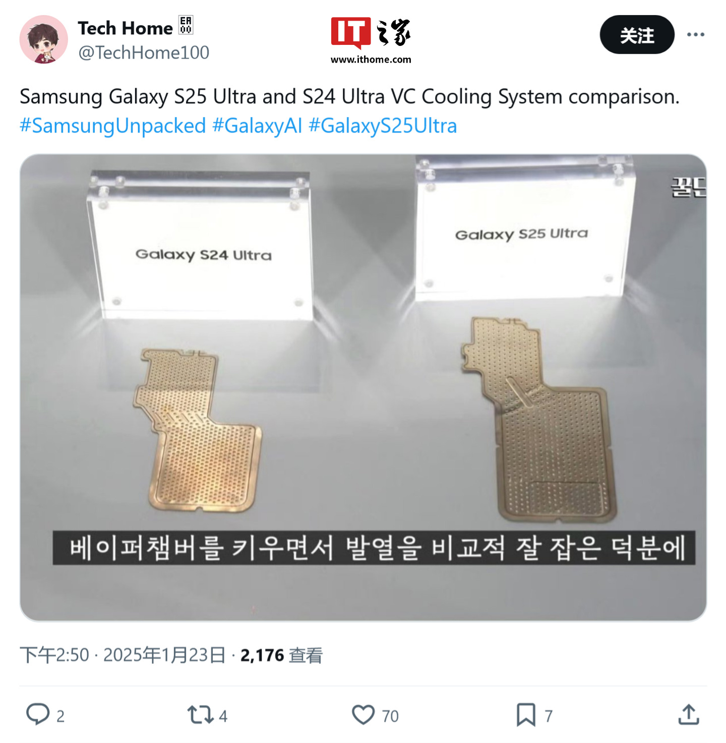 IT之家 1 月 25 日消息,消息源 @TechHome100 于 1 月 23 日在 X 平台发布推文,爆料称三星 Galaxy S25 Ultra 旗舰手机大幅改善散热系统,相比较 Galaxy S24 Ultra,采用了更大面积的 VC 均热板,并通过定制导热材料(TIM),高效提升手机散热效果,确保高性能芯片稳定运行。