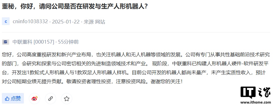中联重科表示,目前该公司开发的机器人都尚未量产,未产生实质性收入,预计对公司短期业绩无提升贡献。