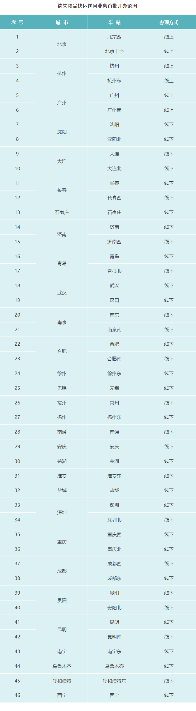 此外,在沈阳北站、长春西站、石家庄站、济南西站、武汉站、南京南站、合肥南站、成都东站、贵阳北站、昆明南站、南宁东站、乌鲁木齐站、呼和浩特东站、西宁站等 40 个重点车站,旅客也可以通过拨打中铁快运官方客服电话 95572 预约线下办理。