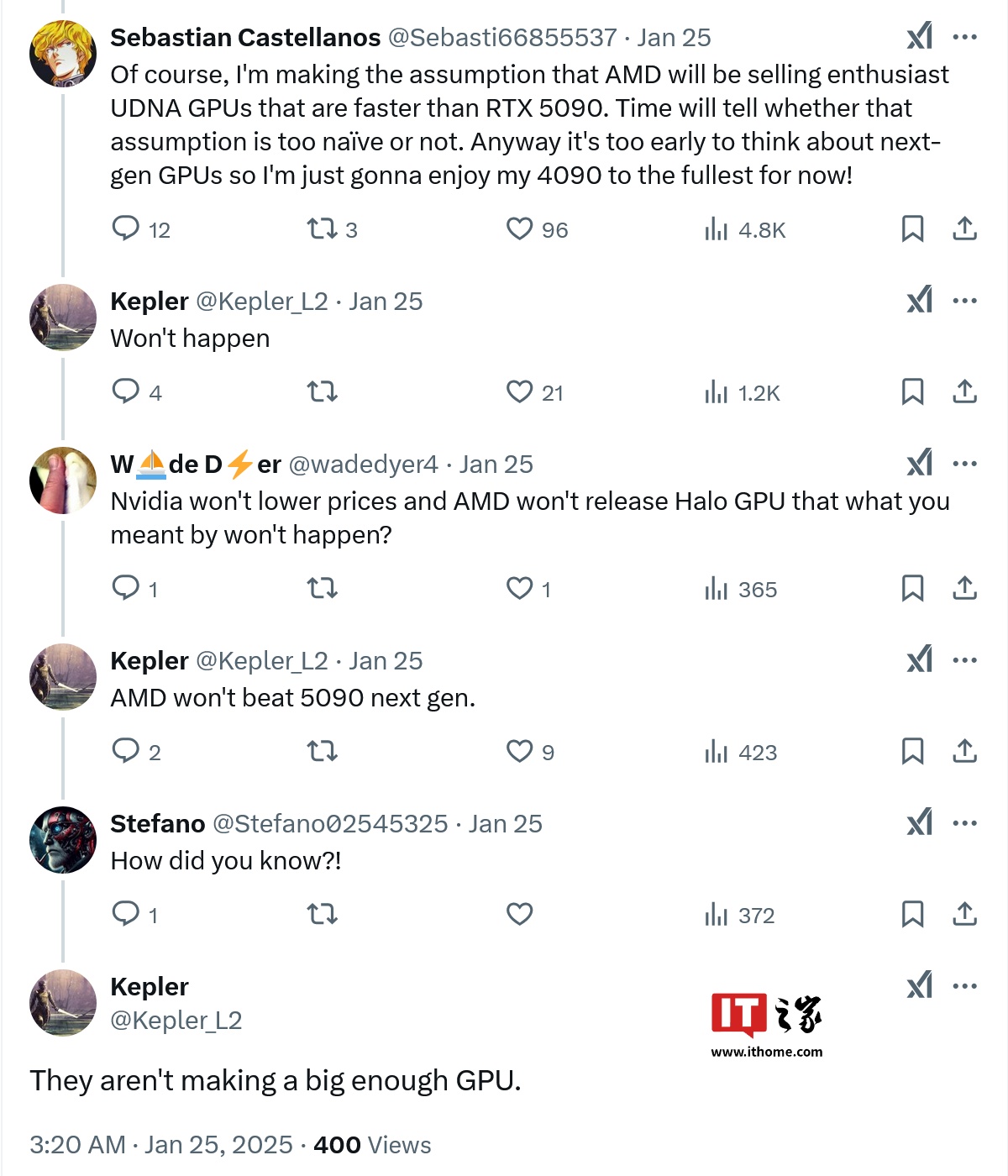 IT之家 1 月 26 日消息,@Kepler_L2 北京时间昨日在 X 平台表示,AMD 首代消费级 UDNA 显卡在性能方面无法击败英伟达即将上市的 GeForce RTX 5090。