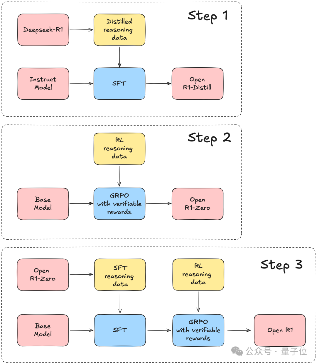 HuggingFace 表示,将以 DeepSeek-R1 的技术报告为指导,分 3 个步骤完成这个项目: