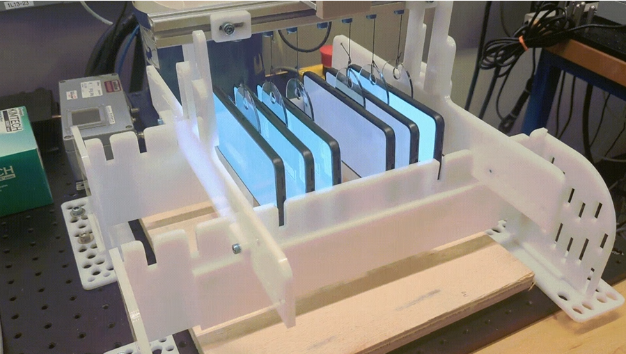 一只机器人手臂反复将平板放进背包并拿出来,以模拟每天打包和卸包的过程。