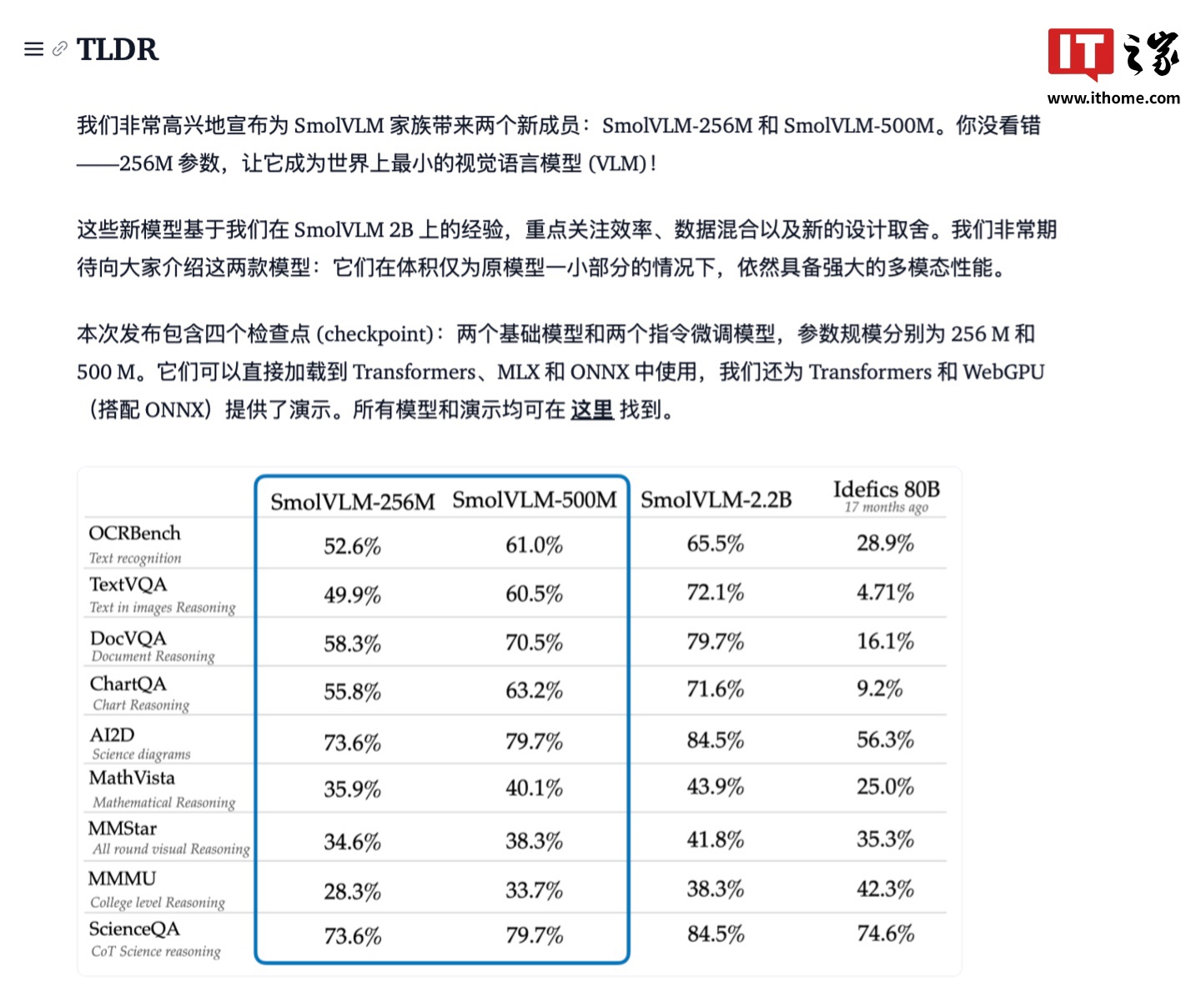 据悉,相应模型主要基于 Hugging Face 团队去年训练的 80B 参数模型蒸馏而成,号称在性能和资源需求之间实现了平衡,官方称 SmolVLM-256M / 500M 两款模型均可“开箱即用”,可以直接部署在 transformer MLX 和 ONNX 平台上。