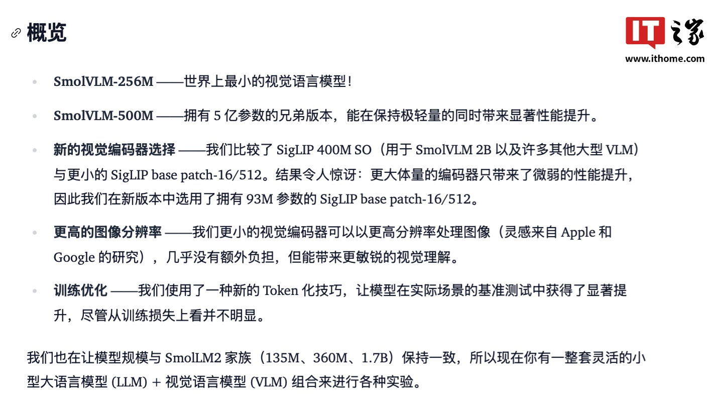 IT之家 1 月 26 日消息,Hugging Face 发布了两款全新多模态模型 SmolVLM-256M 和 SmolVLM-500M,其中 SmolVLM-256M 号称是世界上最小的视觉语言模型(Video Language Model)。