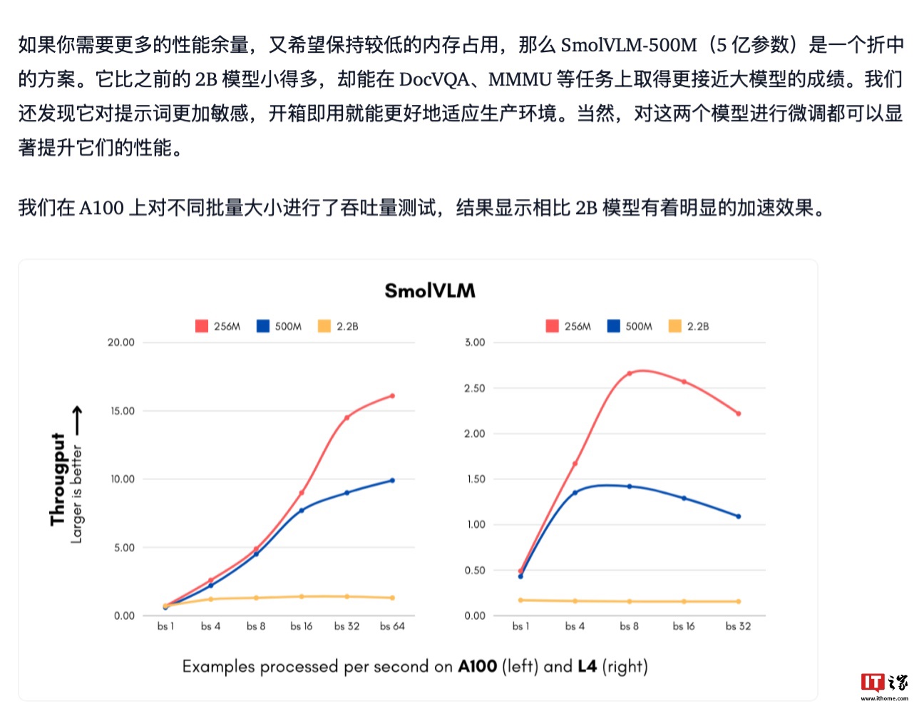 而 SmolVLM-500M 针对需要更高性能的场景而设计,Hugging Face 称相关模型非常适合部署在企业运营环境中,该模型推理单张图片仅需 1.23GB 的 GPU 显存,相对 SmolVLM-256M 虽然负载更大,但推理输出的内容更精准。