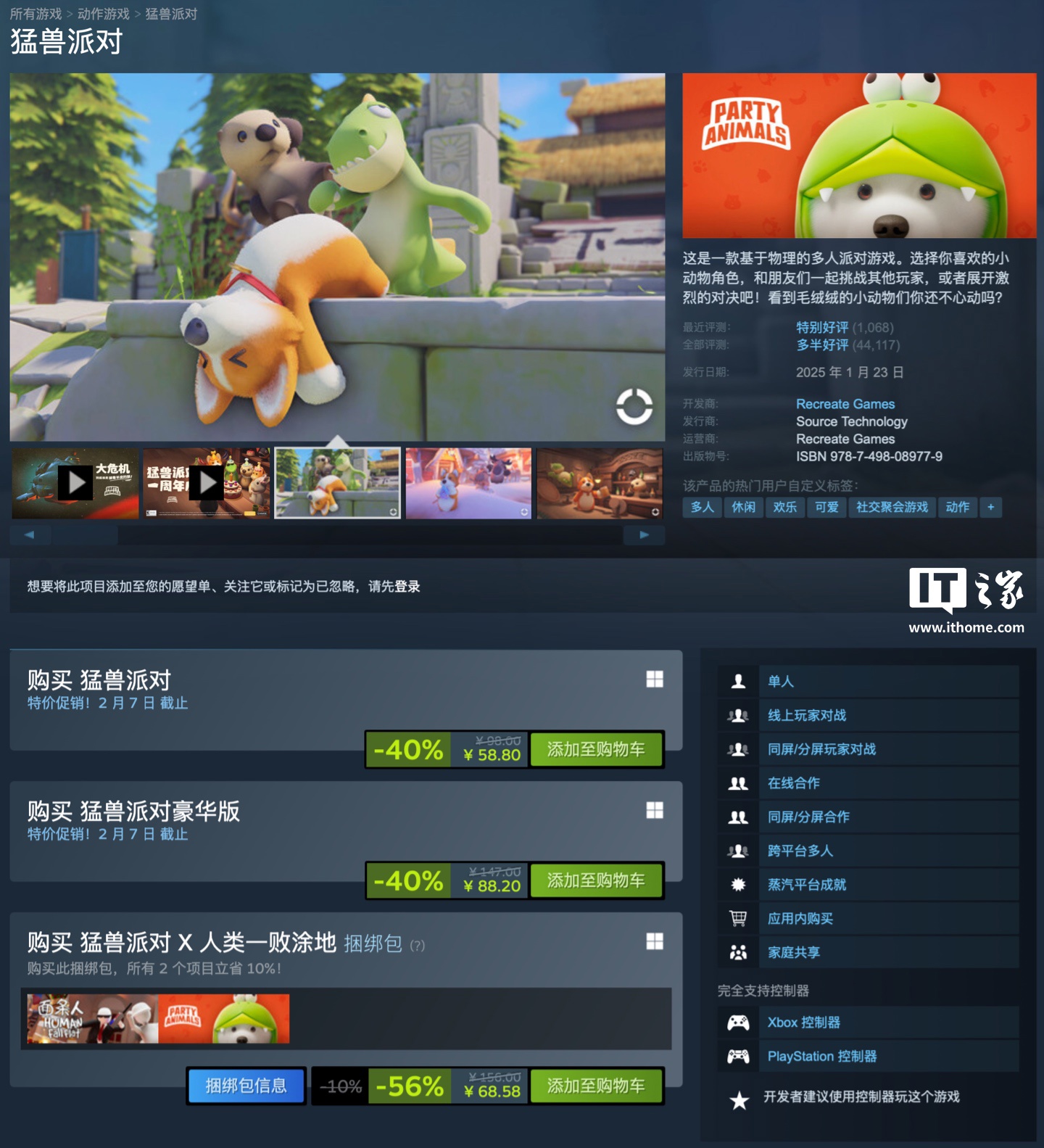 IT之家 1 月 26 日消息,国产多人游戏《猛兽派对》(原名《动物派对》)现已正式登陆蒸汽平台,于 Steam 平台标准价同价,首发 6 折售 58.8 元起,目前好评率 79%“多半好评”。