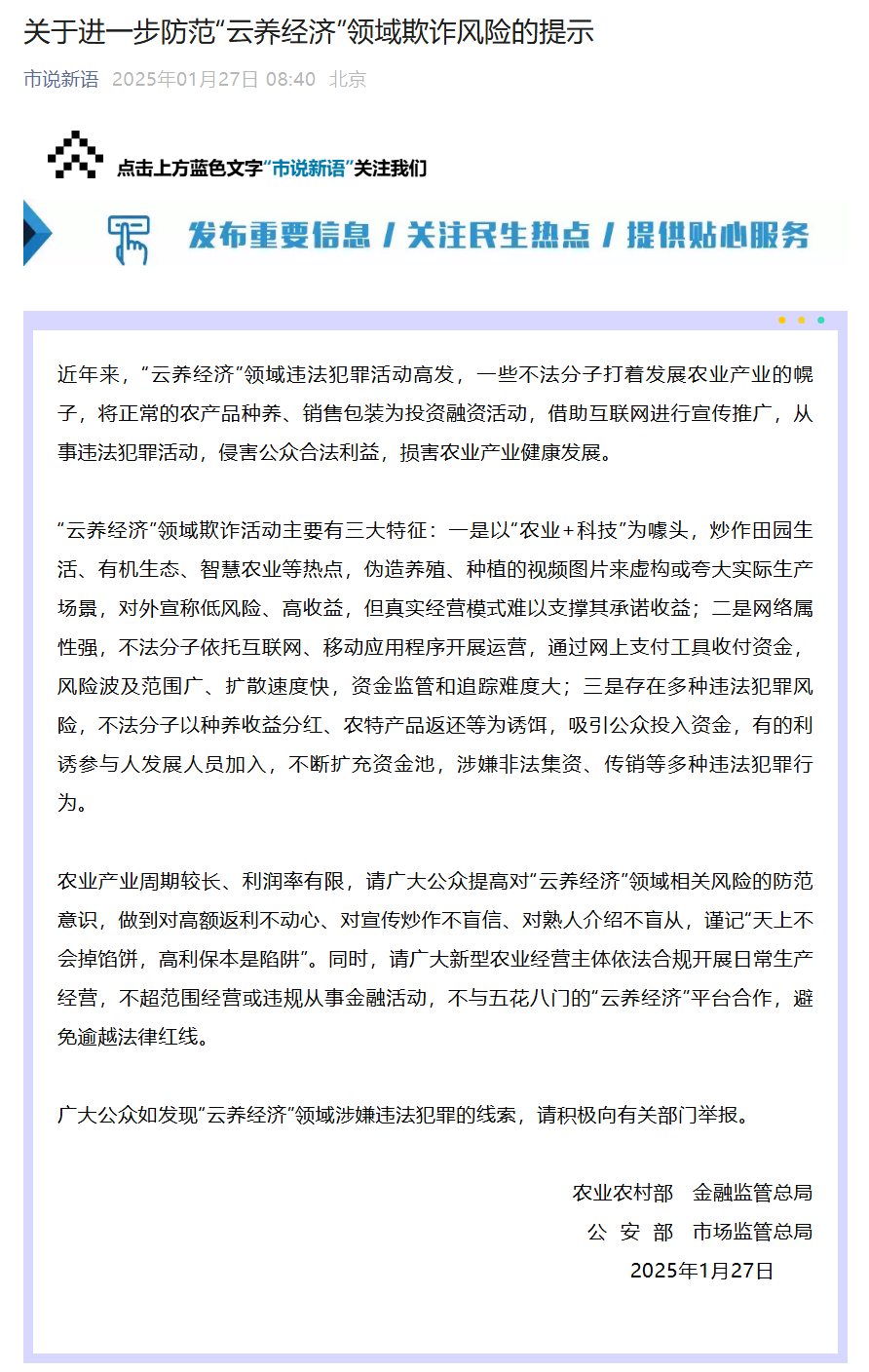 农业产业周期较长、利润率有限,请广大公众提高对“云养经济”领域相关风险的防范意识,做到对高额返利不动心、对宣传炒作不盲信、对熟人介绍不盲从,谨记“天上不会掉馅饼,高利保本是陷阱”。同时,请广大新型农业经营主体依法合规开展日常生产经营,不超范围经营或违规从事金融活动,不与五花八门的“云养经济”平台合作,避免逾越法律红线。