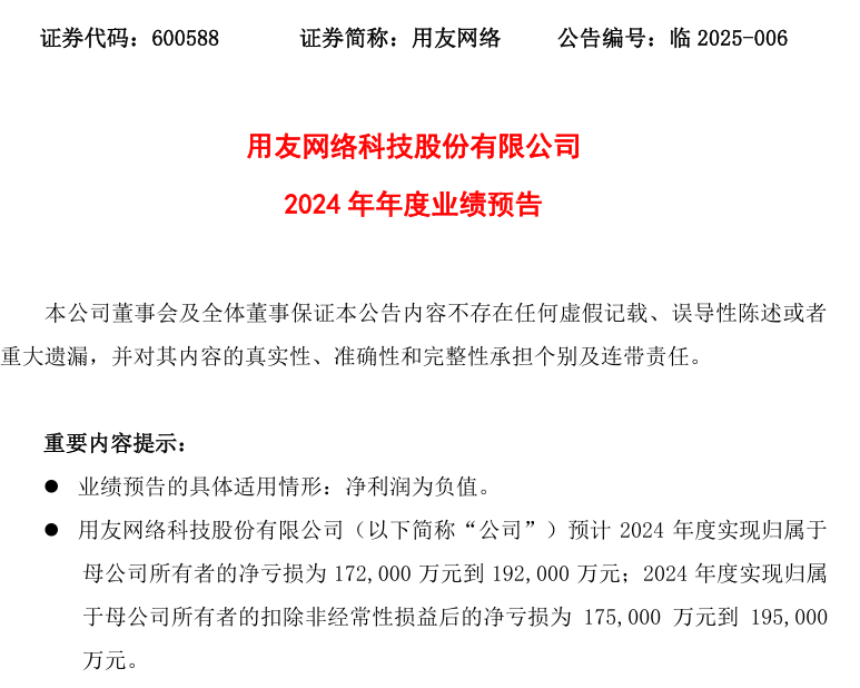 IT之家 1 月 27 日消息,用友网络科技股份有限公司 1 月 24 日发布业绩预告,用友网络预计 2024 年实现归属于母公司所有者的净亏损为 17.2 亿元到 19.2 亿元;预计扣非后净亏损 17.5 亿到 19.5 亿元。用友网络上年同期归属于母公司所有者的净亏损为 9.67 亿元;归属于母公司所有者的扣非净亏损 11 亿元。