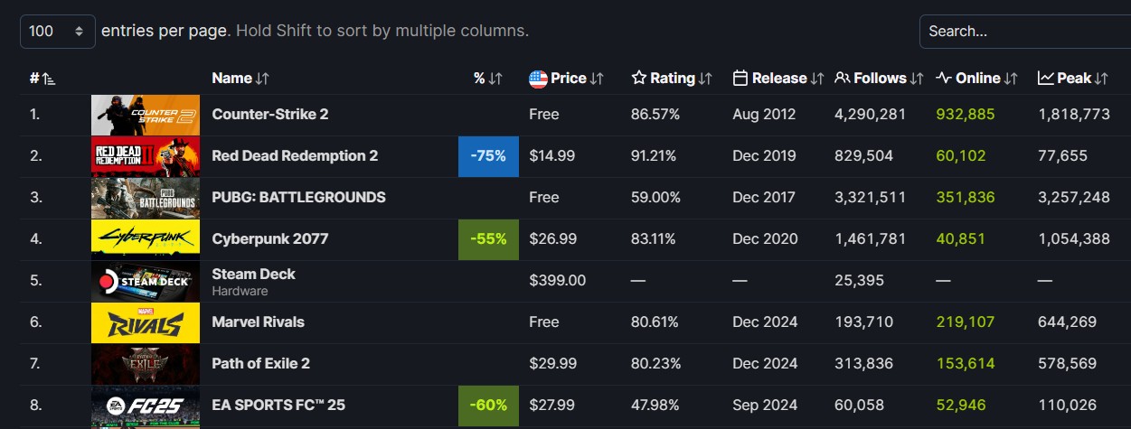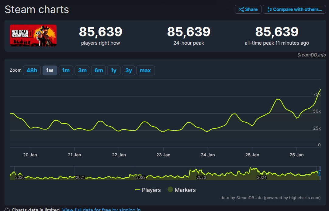 IT之家 1 月 27 日消息,Rockstar Games 旗下的经典开放世界游戏《荒野大镖客:救赎 2》(Red Dead Redemption 2)自 2018 年发售以来便屡获殊荣,由于该作在 Steam 平台上开启了促销,不仅成为当前 Steam 销量榜的第二名,仅次于《反恐精英 2》(Counter-Strike 2),还在过去 24 小时内创下了超过 8.5 万的同时在线玩家峰值,刷新了自 PC 版发售以来的最高纪录。此前的最高纪录为 2023 年创下的 7.5 万同时在线玩家。