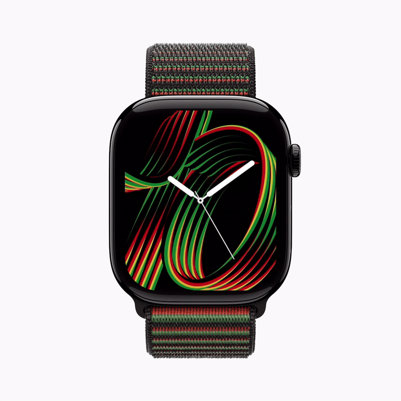 非裔创意人士与苹果共同参与了新系列的设计。该系列名为“Unity Rhythm”(团结韵律),设计融合交织了泛非旗帜的黑色、绿色和黄色。Black Unity 回环式运动表带采用定制编织图案,由凸起和凹陷的圆环构成,形成光栅效果,每个圆环的一侧呈现绿色,另一侧则显现红色。用户佩戴这款表带时,颜色会随着手腕的移动而在绿色与红色间动态变化,在变化过程中还会奇妙地显现出黄色。