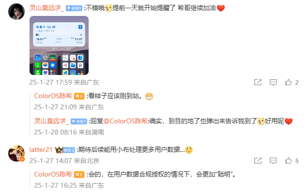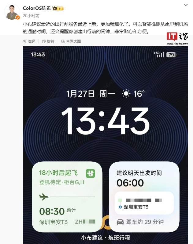 IT之家 1 月 28 日消息,OPPO ColorOS 设计总监陈希昨日发文称,小布建议出行服务最近上新,可智能推测从家里到机场的通勤时间,还会提醒用户创建出行前的闹钟。