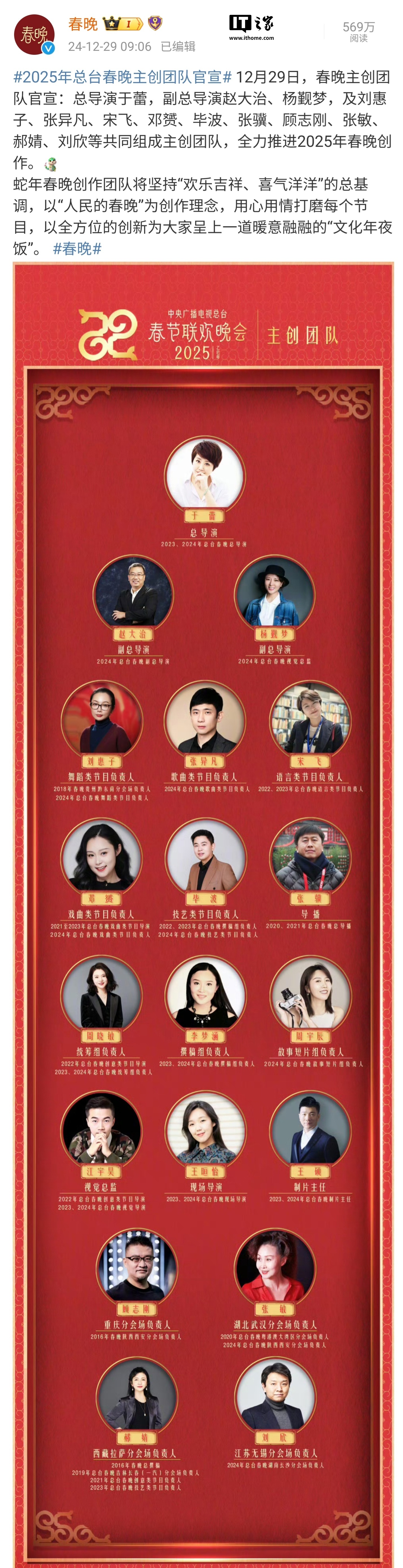 据此前报道,春晚于去年 11 月 29 日已发布主题和主标识。乙巳(sì)蛇年春晚将在欢乐吉祥、喜气洋洋的总基调中,以“巳巳如意,生生不息”为主题,与全球华人相约除夕、欢度农历新年。