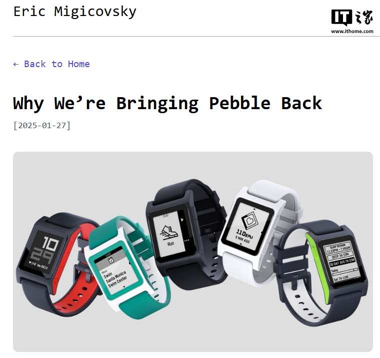 IT之家注意到,Pebble 手表的创始人 Eric Migicovsky 也在当地时间 1 月 27 日宣布回归,他在自己的博客中写道,他每天都戴着 Pebble 手表,已经十多年了,但新硬件的时代已经到来。