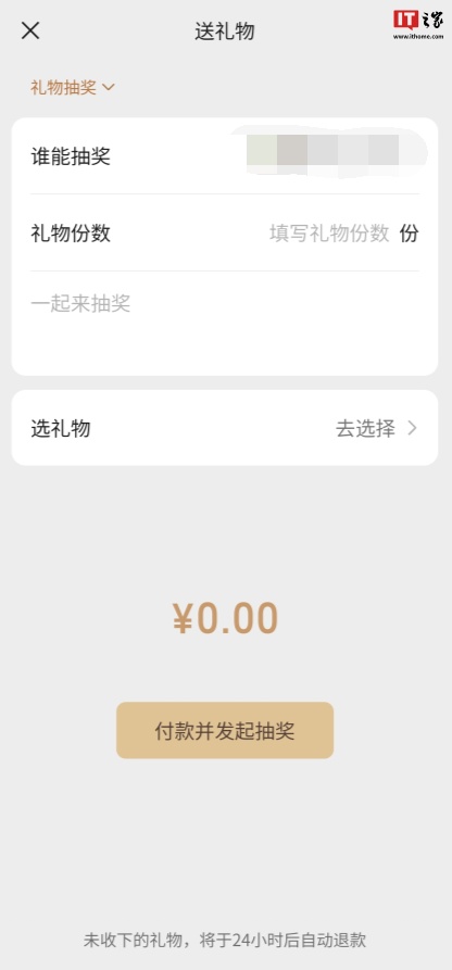 IT之家测试,该功能可以选择“谁能抽奖”,设定礼物份数,以及填写文字说明,付款之后就可以发起抽奖。未收下的礼物,将于 24 小时后自动退款。