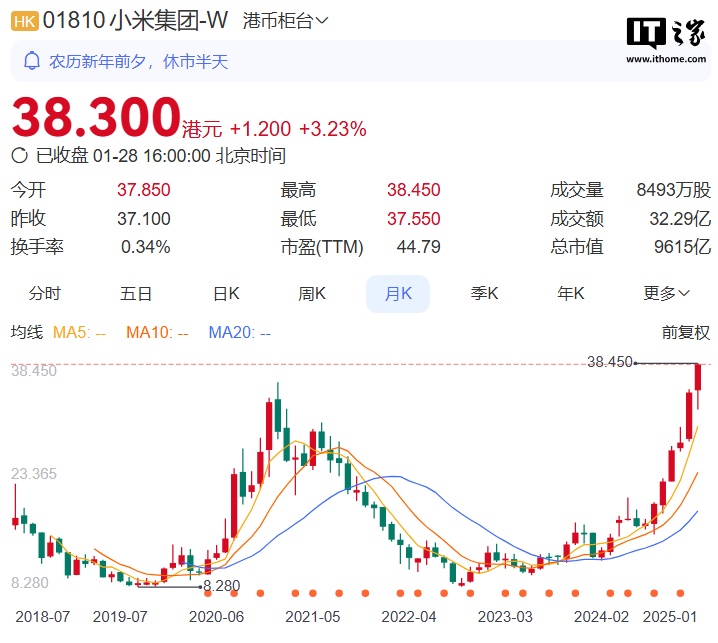 IT之家 1 月 28 日消息,今天是龙年最后一个交易日,港股市场提前半天收市,小米集团截至收盘股价突破 38 港元再创新高,达到 38.3 港元(IT之家备注:当前约 35.7 元人民币),市值达 9614.9 亿港元,直逼万亿大关。