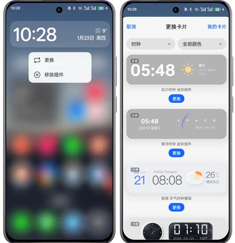 您可以通过双指捏合桌面进入编辑栏,点击底部的“卡片”进入卡片中心,滑到底选择“插件”,即可添加想要的时钟插件。若想更换桌面时钟插件,可长按时钟插件后,点击“更换”,即可进入更换卡片界面选择不同样式的时钟插件。