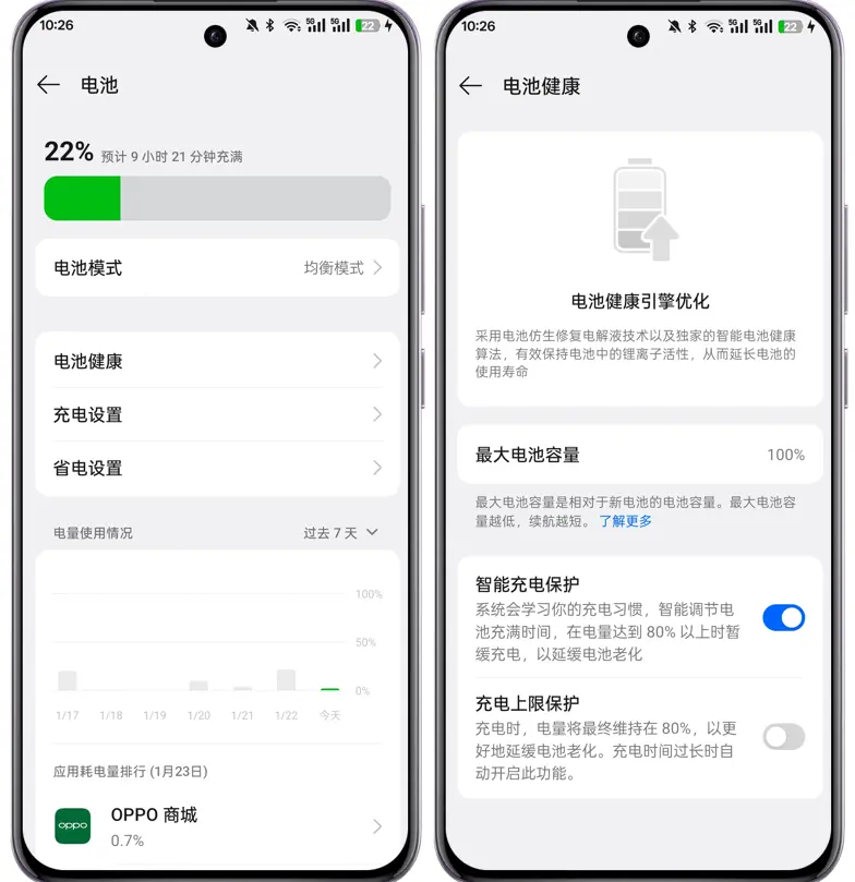 电池健康的最大电池容量,反映当前的电池老化程度,为电池回收或更换决策提供依据。80% 以上的电池健康度是体验比较好的一个值,低于这个值也可以正常使用,但是为了您的使用体验,建议到服务中心检测,如您的手机在保修期内检测无外力损坏则可免费更换。