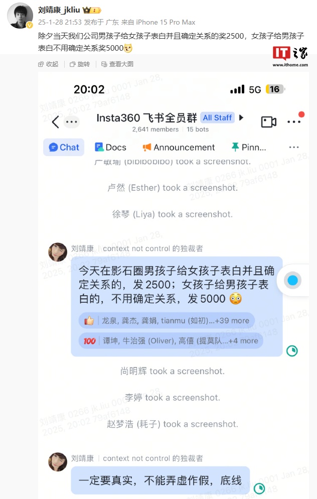 IT之家 1 月 29 日消息,影石 Insta360 CEO 刘靖康昨日晚发文透露,除夕当天公司男孩子给女孩子表白并且确定关系的奖 2500(此处预计指代现金奖励 2500 元,后同),女孩子给男孩子表白不用确定关系奖 5000。