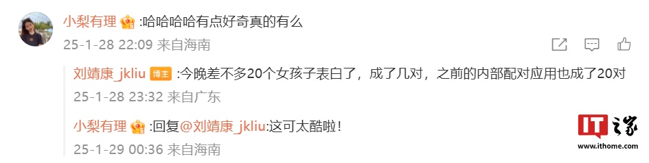 另外,刘靖康还在评论区中回复了网友关于此事真假的质疑,称昨晚差不多 20 个女孩子表白了,成了几对,之前的内部配对应用也成了 20 对。
