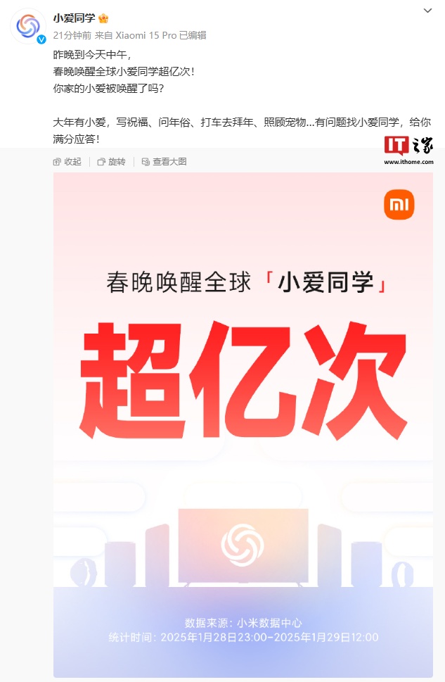 IT之家 1 月 29 日消息,小米智能助手“小爱同学”官方账号今日分享了来自小米数据中心的信息,称昨晚到今天中午,春晚唤醒全球小爱同学超亿次(统计时间:2025 年 1 月 28 日 23:00 - 2025 年 1 月 29 日 12:00)。