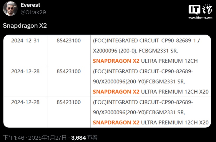 1 月 27 日,爆料人 Olrak_29 透露了一张发货清单,显示骁龙 X2 系列确实存在,而且有“Ultra Premium”后缀,预计是比当前 X 系列产品线更高端的产品,IT之家将跟进后续消息。