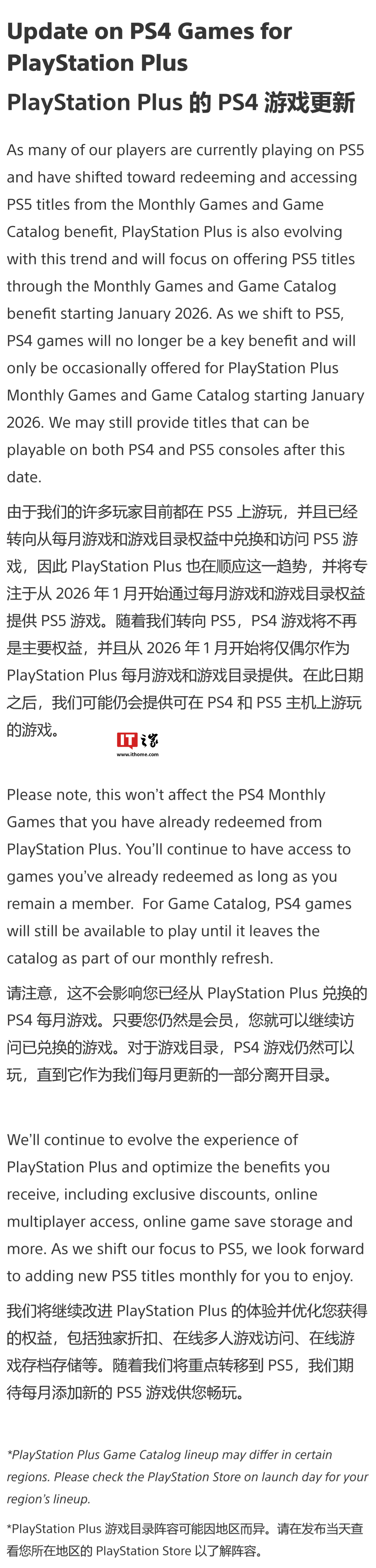 IT之家 1 月 30 日消息,索尼宣布自 2026 年 1 月起,PlayStation Plus 会员服务中的基本档(Essentials)月度游戏和游戏库将削减提供 PS4 游戏,转而专注于 PS5 游戏。