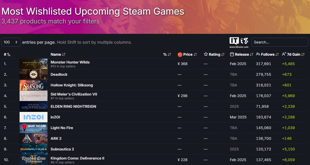 根据 SteamDB 的数据,这款游戏的关注度在过去一年中稳步攀升,逐渐超越了许多其他热门游戏和系列作品。IT之家注意到,这款游戏目前已经超越《Deadlock》及《空洞骑士:丝之歌》成为 Steam 上最受期待的游戏(加入愿望单最多的待发售作品)。