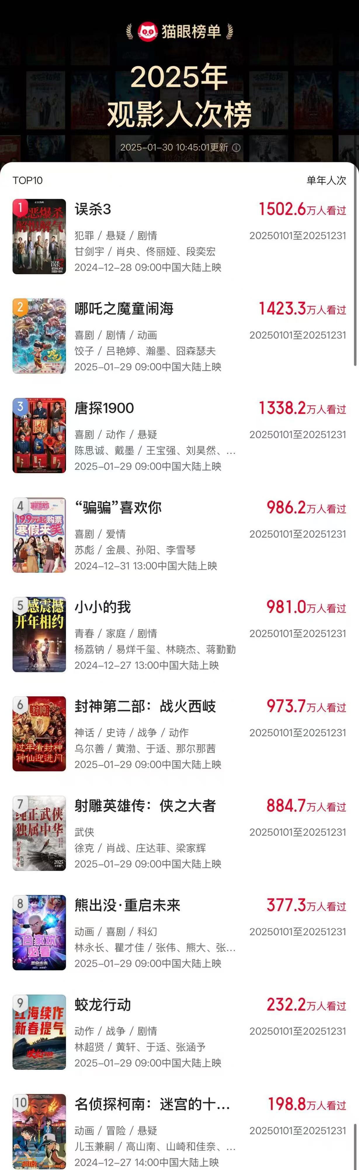 IT之家 1 月 30 日消息,据猫眼专业版数据,截至 10 时 43 分,2025 年度总观影人次破亿,总票房 45.46 亿,总场次 1262 万场,平均票价 45.4 元,《误杀 3》暂列 2025 年观影人次榜首位。