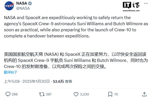美国 NASA 今日发文称,正与太空探索技术公司(SpaceX)加紧努力,力争尽快安全接回因波音“星际客机”飞船技术故障滞留在国际空间站的两名美国宇航员。
