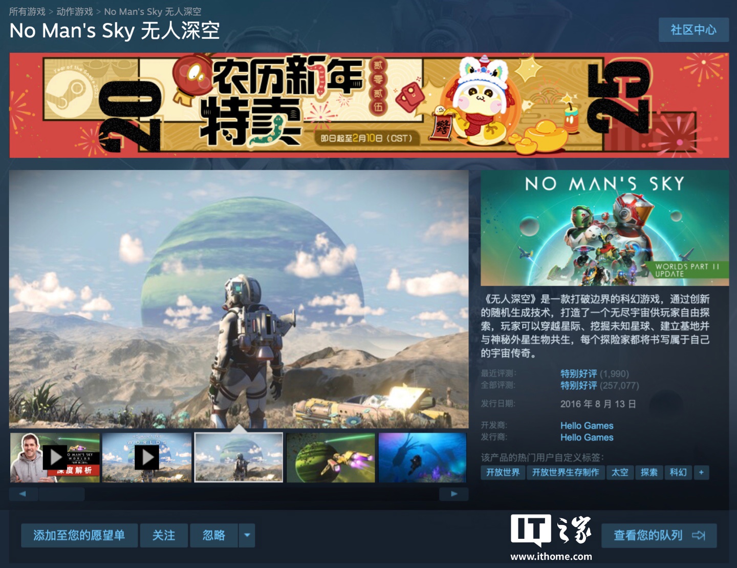 截至IT之家发稿,目前《无人深空》正在 Steam 平台进行 4 折优惠,游戏原价 175 元,现价为 60 元,游戏好评率为 80%“特别好评”,IT之家附游戏商品页如下。