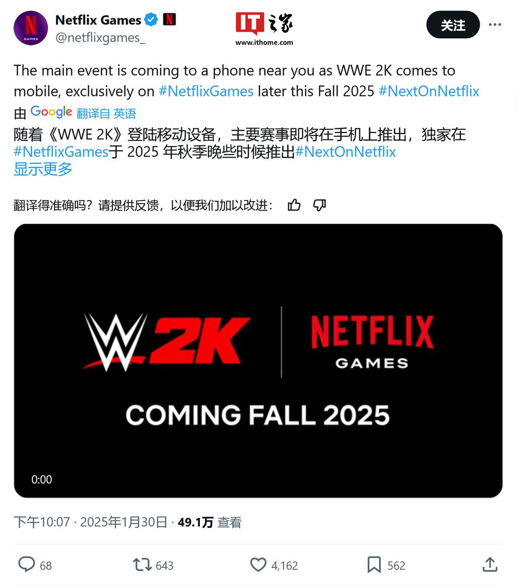 IT之家 1 月 31 日消息,网飞(Netflix)昨日(1 月 30 日)在 X 平台发布推文,宣布将于 2025 年秋季推出 iOS 和安卓版《WWE 2K》手游。