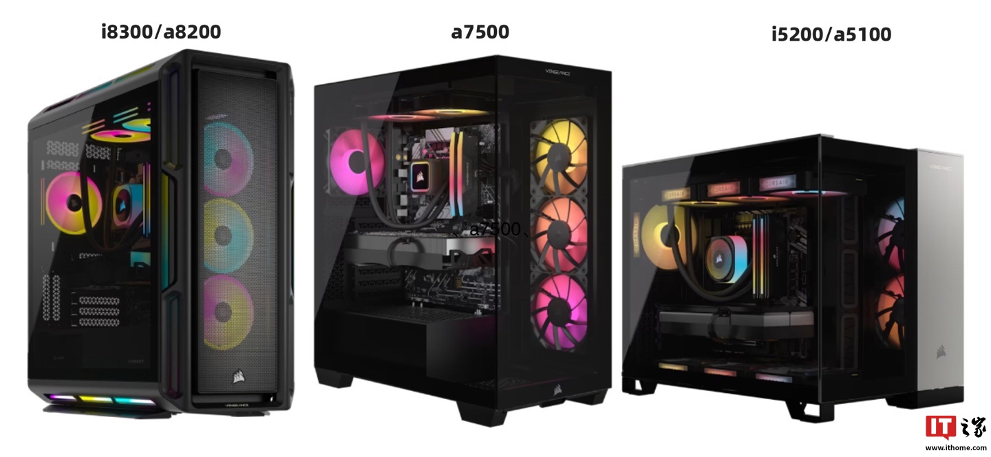 系列台式机拥有三种机箱,其中 Vengeance i8300 / a8200 台式机采用海盗船 5000T 中塔机箱;而 a7500 采用海盗船 3500X 中塔机箱;i5200 / a5100 采用海盗船 2500X 海景房机箱。