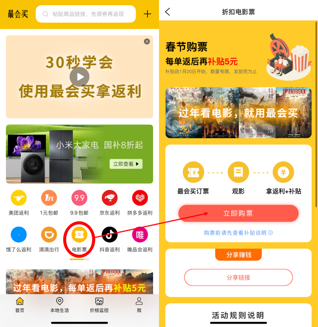 为感谢所有用户的支持,IT之家的姊妹 App 最会买决定自掏腰包开启“电影票优惠 + 补贴 5 元 + 支持后续返利”三重观影优惠活动。