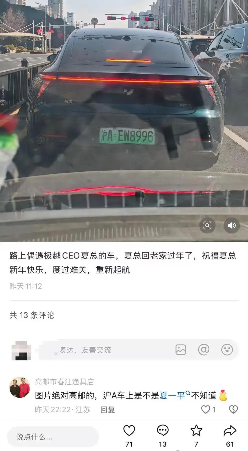 此外,日前还有江苏高邮本地网友表示路遇夏一平的车,是一辆极越 07。知情人士处透露,该车牌号正是夏一平的。