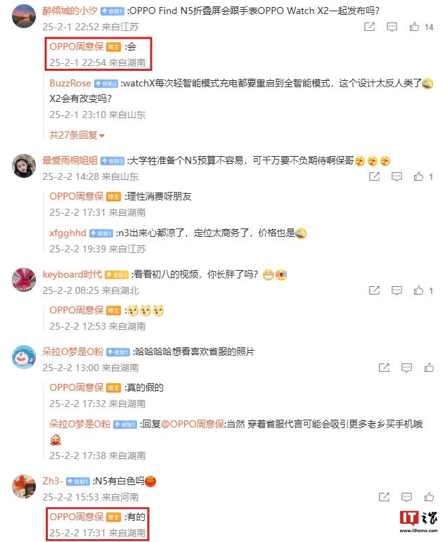 OPPO Find 系列产品负责人周意保本月(2 月 1 日)在自己的微博评论区中回复了部分网友的问题:针对 OPPO Find N5 是否会和 Watch X2 一起发布,他回复“会”;针对 N5 是否有白色款,他表示“有的”。