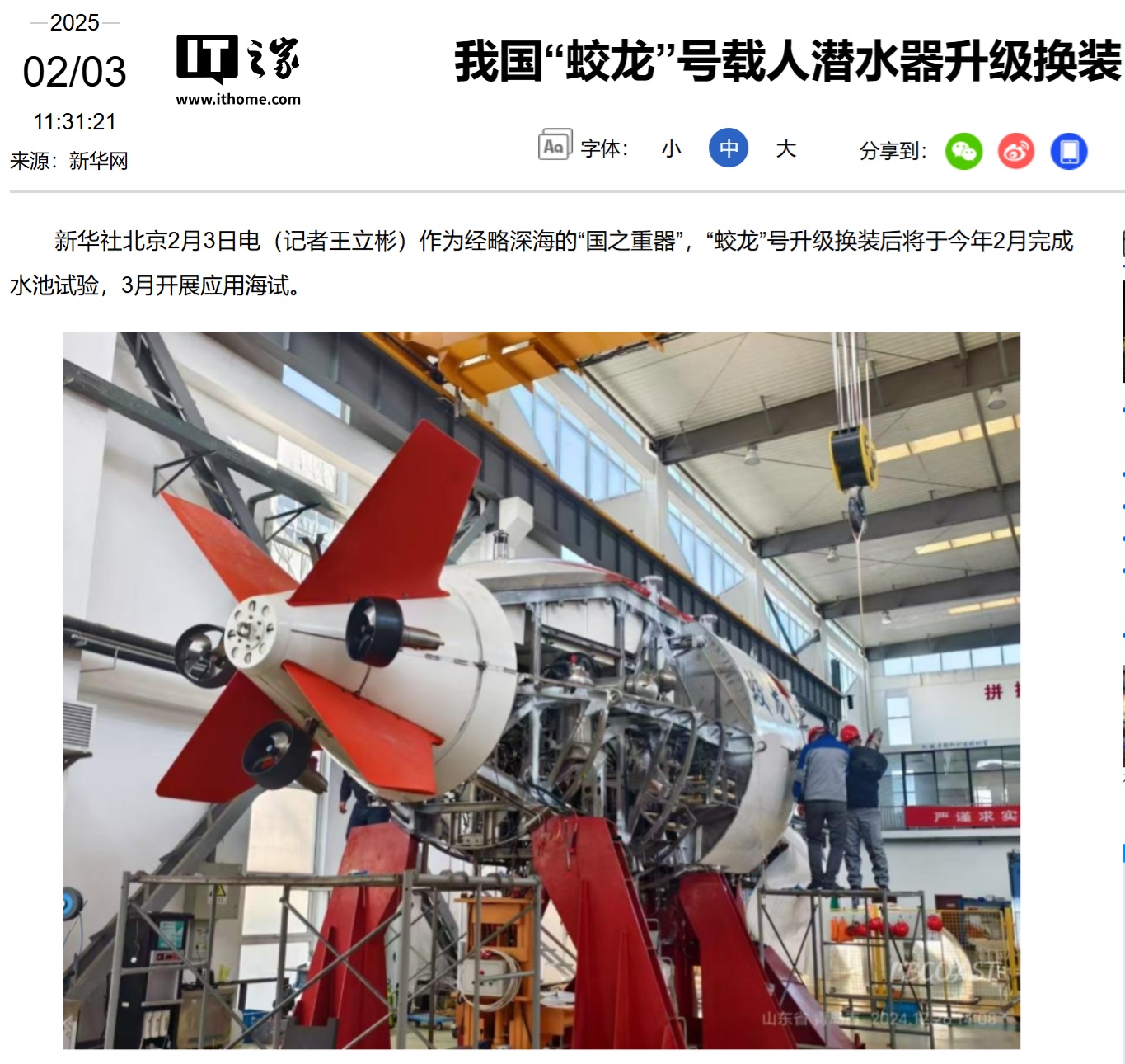 IT之家 2 月 3 日消息,据新华社报道,中国自主研发的 7000 米级载人潜水器“蛟龙”号正在紧锣密鼓地开展关键部件的升级改造工作,升级换装后预计将于今年 2 月完成水池试验,并于 3 月在南海开展应用海试。
