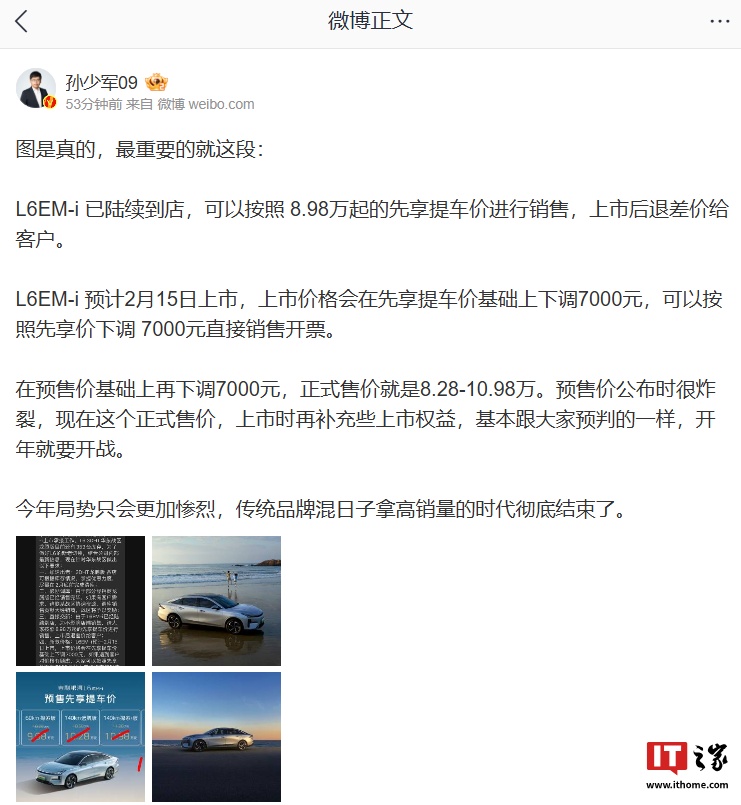IT之家 2 月 3 日消息,博主 @孙少军09 今日发文分享了一张截图,其中提到了吉利银河 L6 EM-i 汽车相关销售信息,重点内容如下: