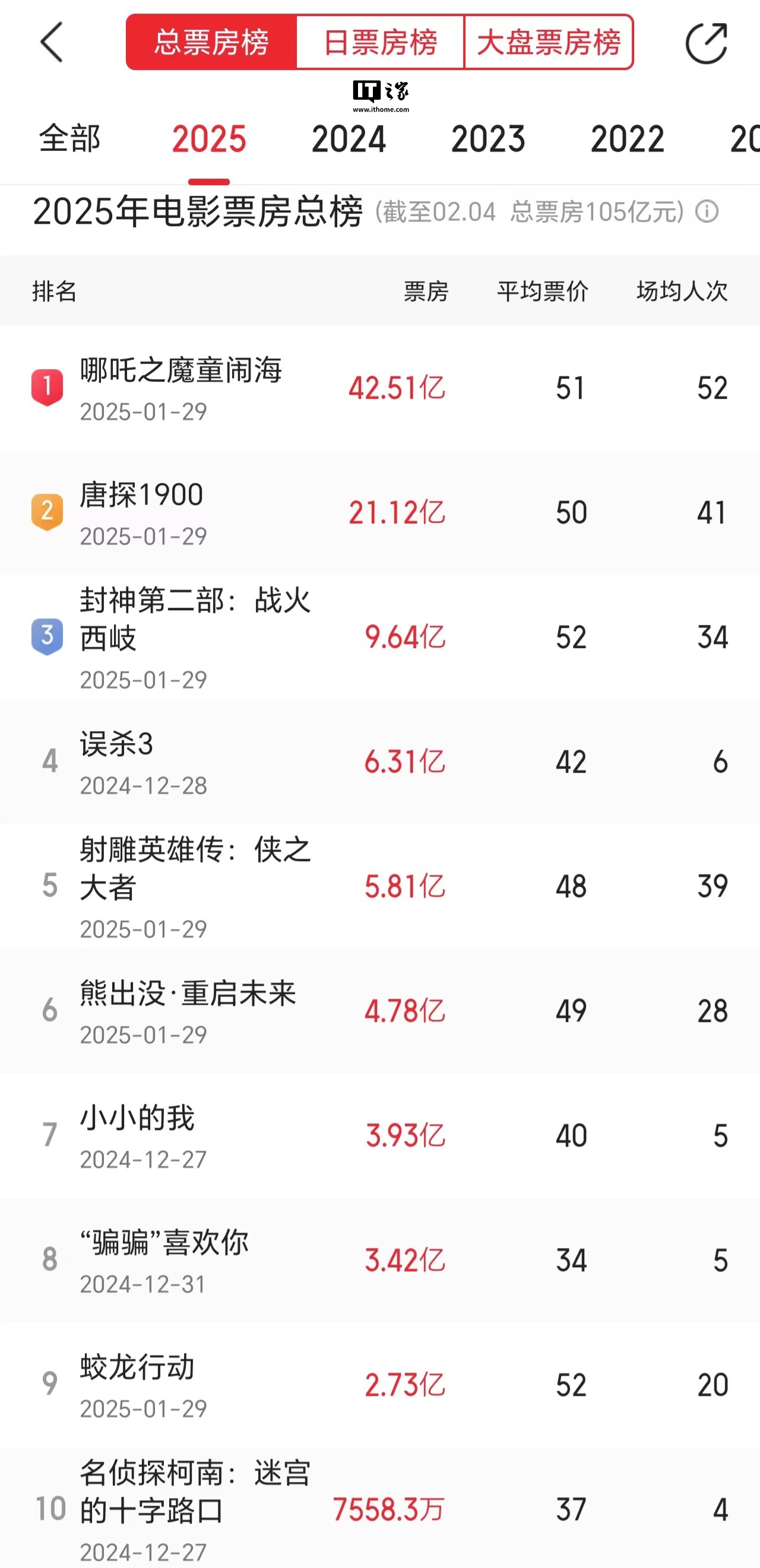 IT之家查询猫眼专业版数据获悉,目前(截至 2 月 4 日)2025 年度中国电影市场总票房 105 亿,影片票房排名如下: