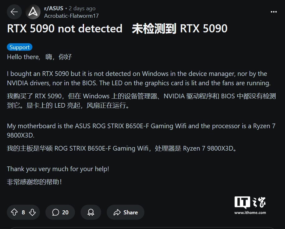 不仅如此,使用 GeForce RTX 5090 显卡的用户也报告了类似的问题,这表明该问题可能并非仅限于 RTX 5090D 型号。在华硕的 Reddit 论坛上,有用户表示其 RTX 5090 显卡在 Windows 系统中既无法通过 BIOS 识别,也无法通过驱动程序识别。