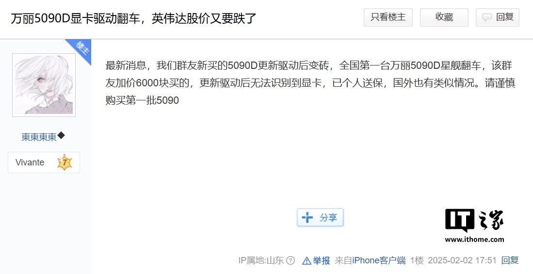 IT之家 2 月 4 日消息,近期 NVIDIA GeForce RTX 5090 和 5090D 显卡在国内多个平台和社交媒体上引发热议,原因是大量用户反映在安装最新驱动程序后,显卡出现“变砖”问题,导致设备无法正常使用。这一问题已在 Chiphell、百度贴吧以及 Bilibili 等平台上引发了大量讨论。